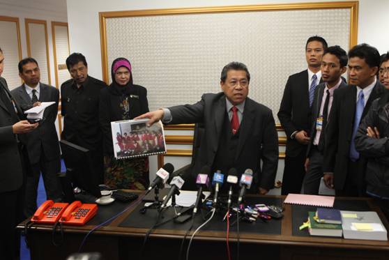 Speaker Dewan Rakyat menunjukkan salah satu bukti penyalahgunaan ruang sidang media di bangunan Parlimen.