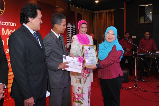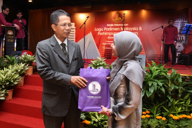 Juara Pertandingan Mencipta Lagu Rasmi Parlimen Malaysia iaitu Pn. Nuraishah Abdullah menerima hadiah berupa wang tunai dan sijil penyertaan dari Ketua Pentadbir Parlimen Malaysia E73G93621001