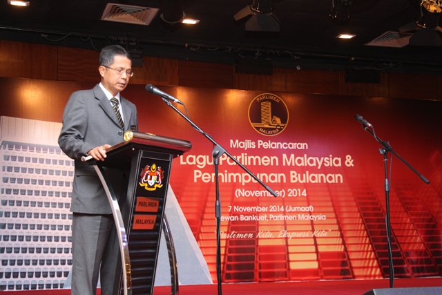 YBhg.Datuk Lamien Sawiyo menyampaikan ucapan dan amanatnya semasa Majlis Pelancaran Lagu Parlimen Malaysia dan Perhimpunan Bulan November 2014 E73G93291001