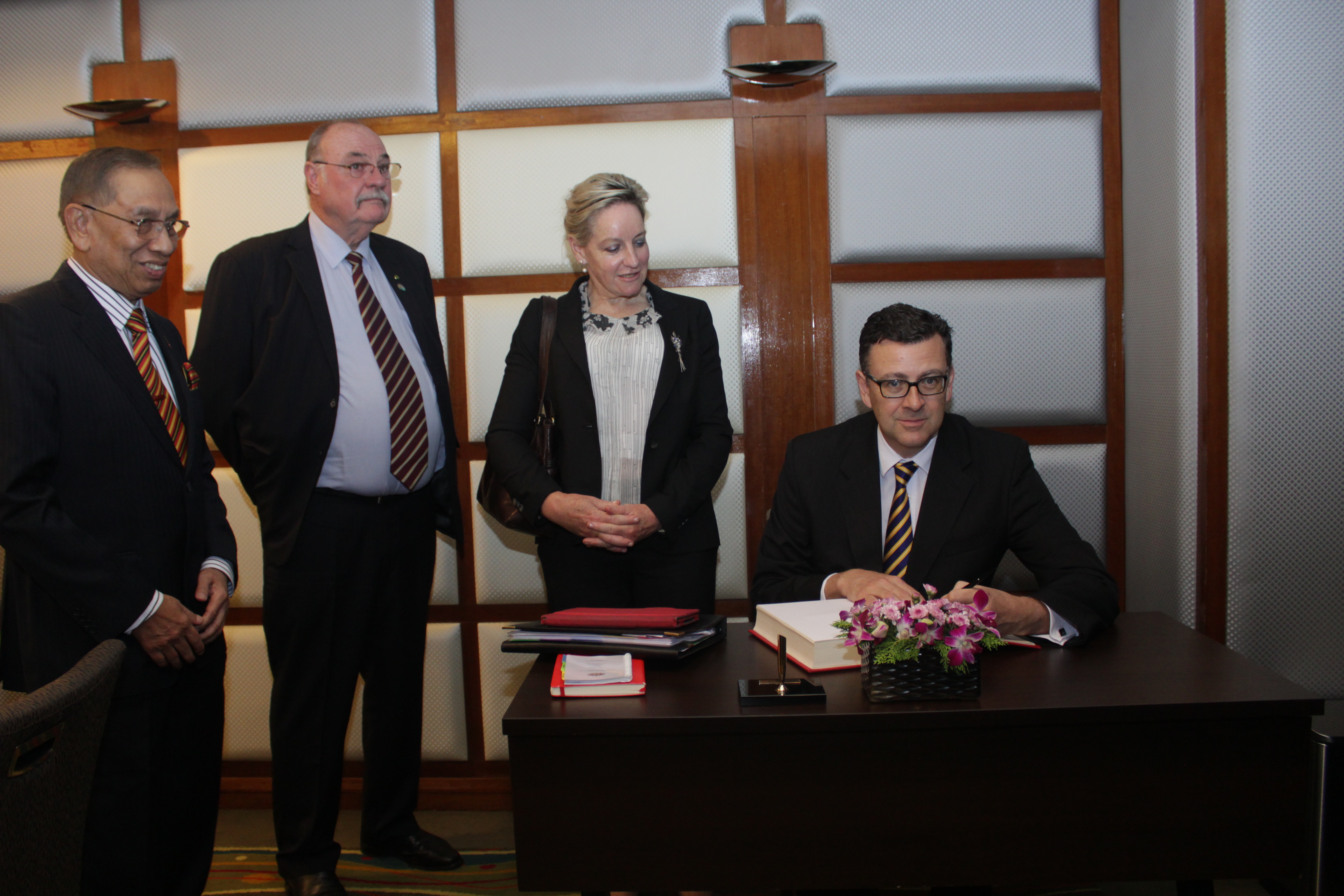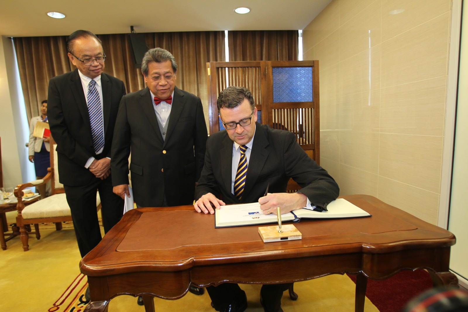Dr.Andrew Southcott, Ahli Parlimen Australia menandatangani buku pelawat sambil diperhatikan oleh Yang di-Pertua Dewan Negara. Kunjungan hormat tersebut telah diadakan di Seraya Room, Seri Pacific Hotel.IMG_0522
