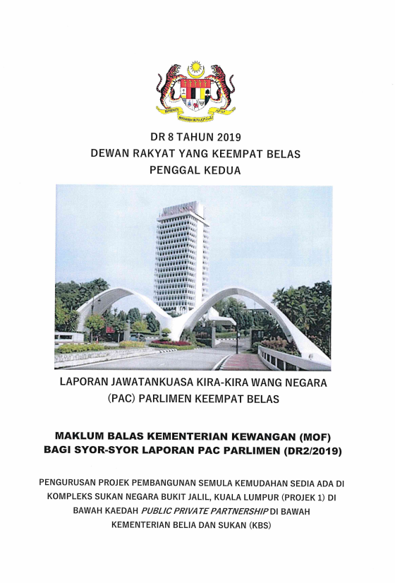 DR8/2019 - Maklum Balas Kementerian Kewangan (MOF) Bagi Syor-Syor Laporan PAC Parlimen (DR2/2019) Berhubung Pengurusan Projek Pembangunan Semula Kemudahan Sedia Ada Di Kompleks Sukan Negara Bukit Jalil, Kuala Lumpur (Projek 1) Di Bawah Kaedah Public Priv